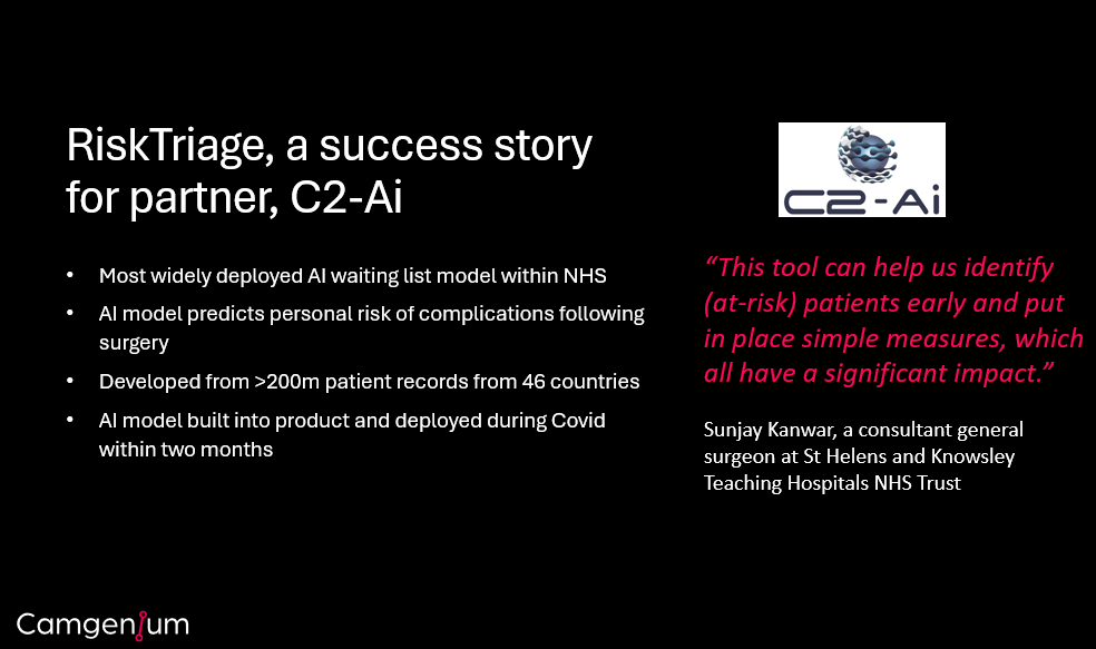 Let me share a success story about a product we developed for our partner, C2-Ai. Their AI-powered waiting list model is now the most widely deployed within the NHS. It predicts an individual’s risk of complications following surgery, built on a foundation of data from millions of patient records. At the height of Covid, we developed and deployed the first version of this product in just two months.