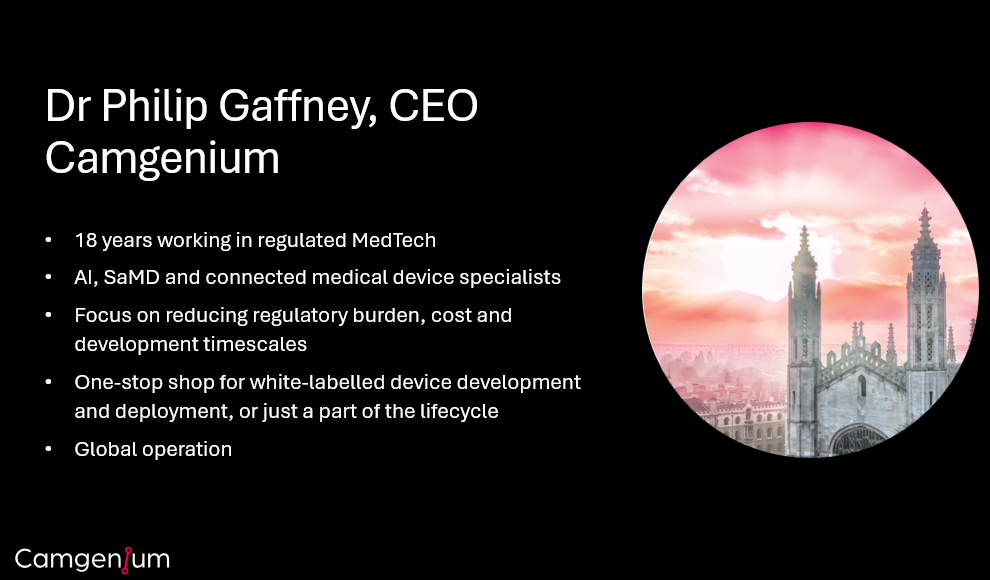 For the past 18 years, I’ve worked in regulated MedTech, leading Camgenium to specialise in AI, Software as a Medical Device, and connected medical devices.